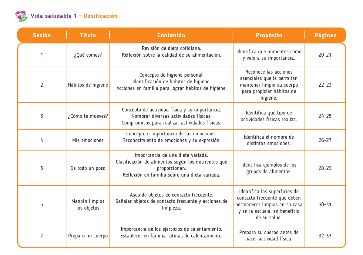 Encontrará tablas que indican cómo están organizados los contenidos y temas de Vida saludable y podrá saber cuál es el propósito que le corresponde a cada sesión de trabajo. Esta integrada por número de sesión, título, contenido o tema, propósito y página del libro del alumno en la que se ubica.