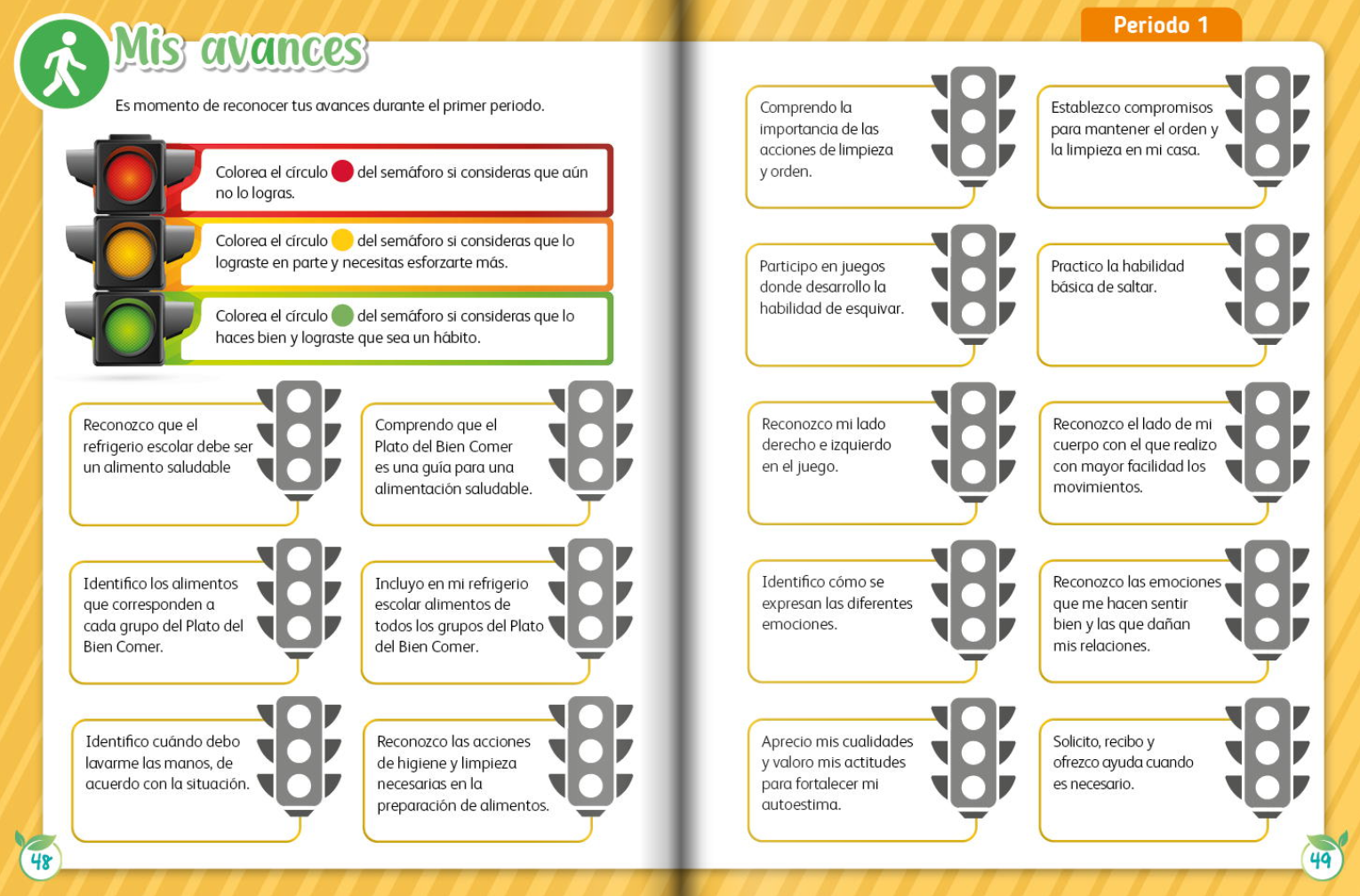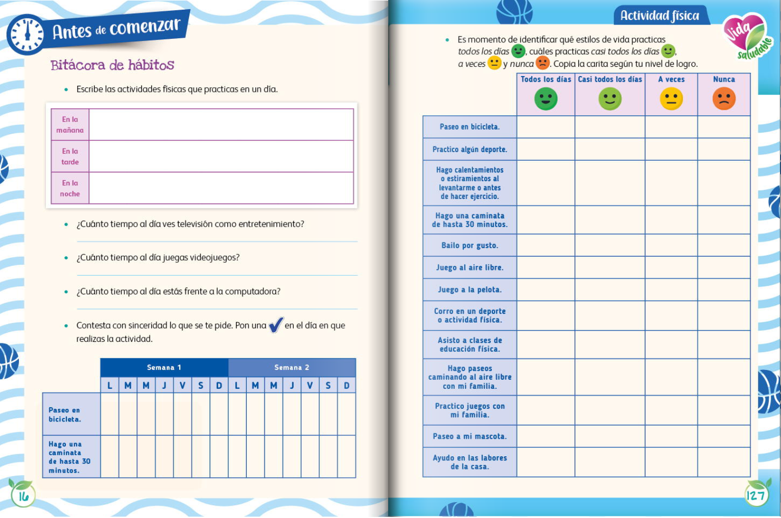 Contiene bitácoras de salud con indicadores que ayudarán a los estudiantes a registrar e identificar los hábitos personales que tienen antes de comenzar el año escolar y los cambios que lograrán después del estudio de los temas de Vida saludable y de la resolución de las actividades del cuaderno de trabajo.